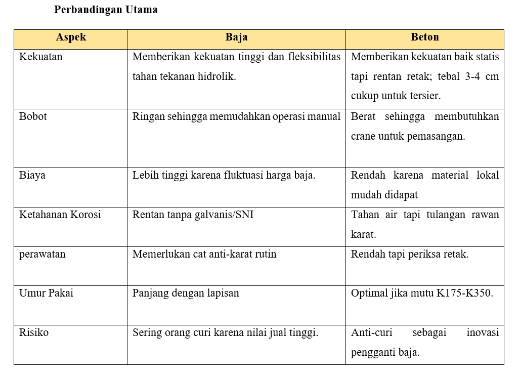 Daun pintu air baja unggul dalam kekuatan fleksibel dan bobot ringan untuk irigasi tersier, sementara beton lebih ekonomis dan anti-curi, sehingga ideal menggantikan baja yang sering orang curi di lahan sawah. Perbandingan ini relevan untuk proyek di Surakarta dengan kondisi lembab dan kebutuhan maintenance rendah seperti bushing gearbox. Baja galvanis menahan korosi jika tim melapisinya, sedangkan beton memerlukan tulangan anti-karat untuk umur panjang.